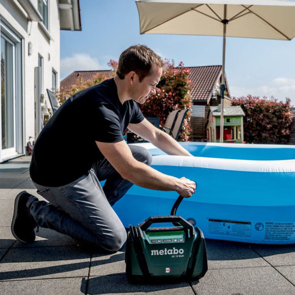 The Metabo AK 18 Multi is a versatile cordless compressor, perfect for inflating tyres, balls, air mattresses, and more. It features a high-pressure function for car and bicycle tyres and a volume function for quickly filling or deflating larger inflatables. The large high-contrast display provides real-time pressure readings in bar, psi, or kPa. With automatic shutoff, it stops inflating once the target pressure is reached, ensuring accuracy. Additionally, the built-in LED light improves visibility, and it operates via 18V battery packs or a 12V car cable for flexibility.
